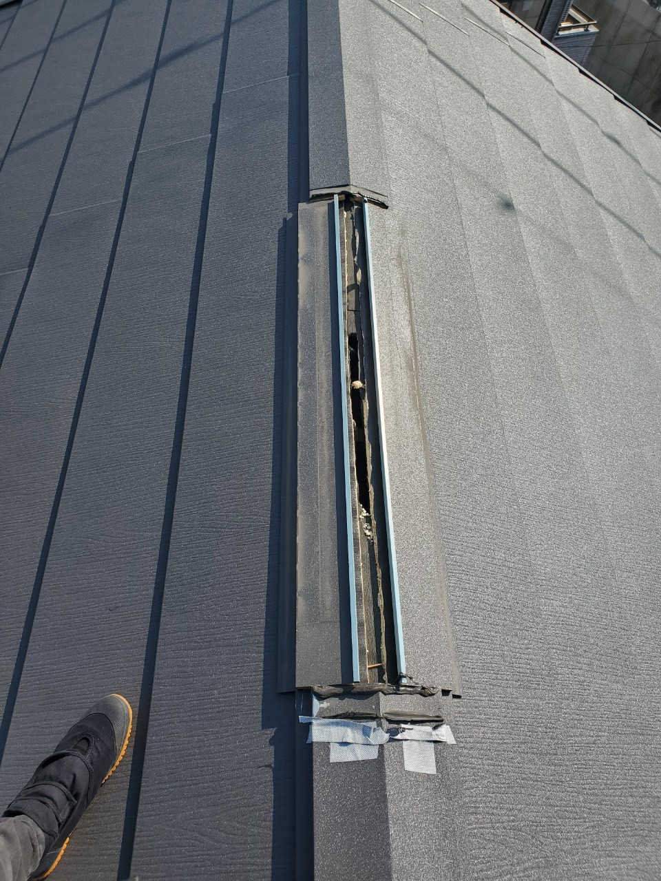 現地へ伺い屋根を確認すると、棟板金が外れてしまっている状態で、以前に他社様で行われたカバー工法の施工箇所であることが分かりました。