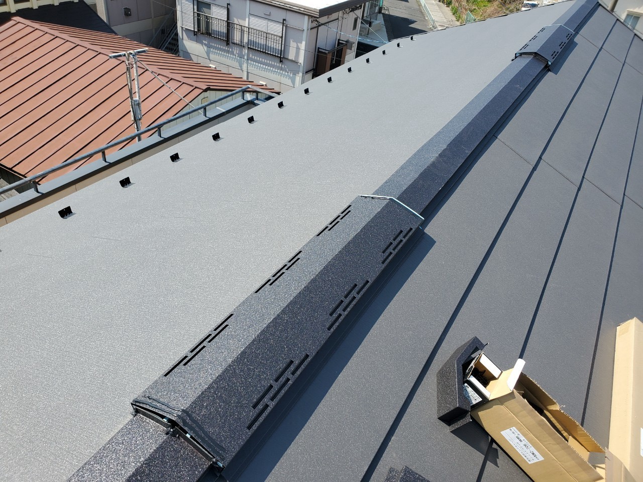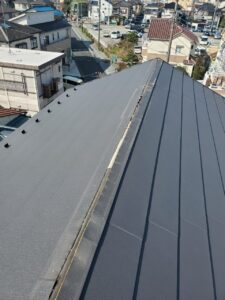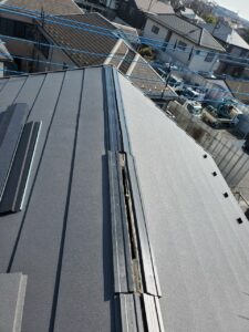 施工後は棟板金の浮きや歪みもなくなり、しっかりと屋根に固定された状態へと仕上がりました。